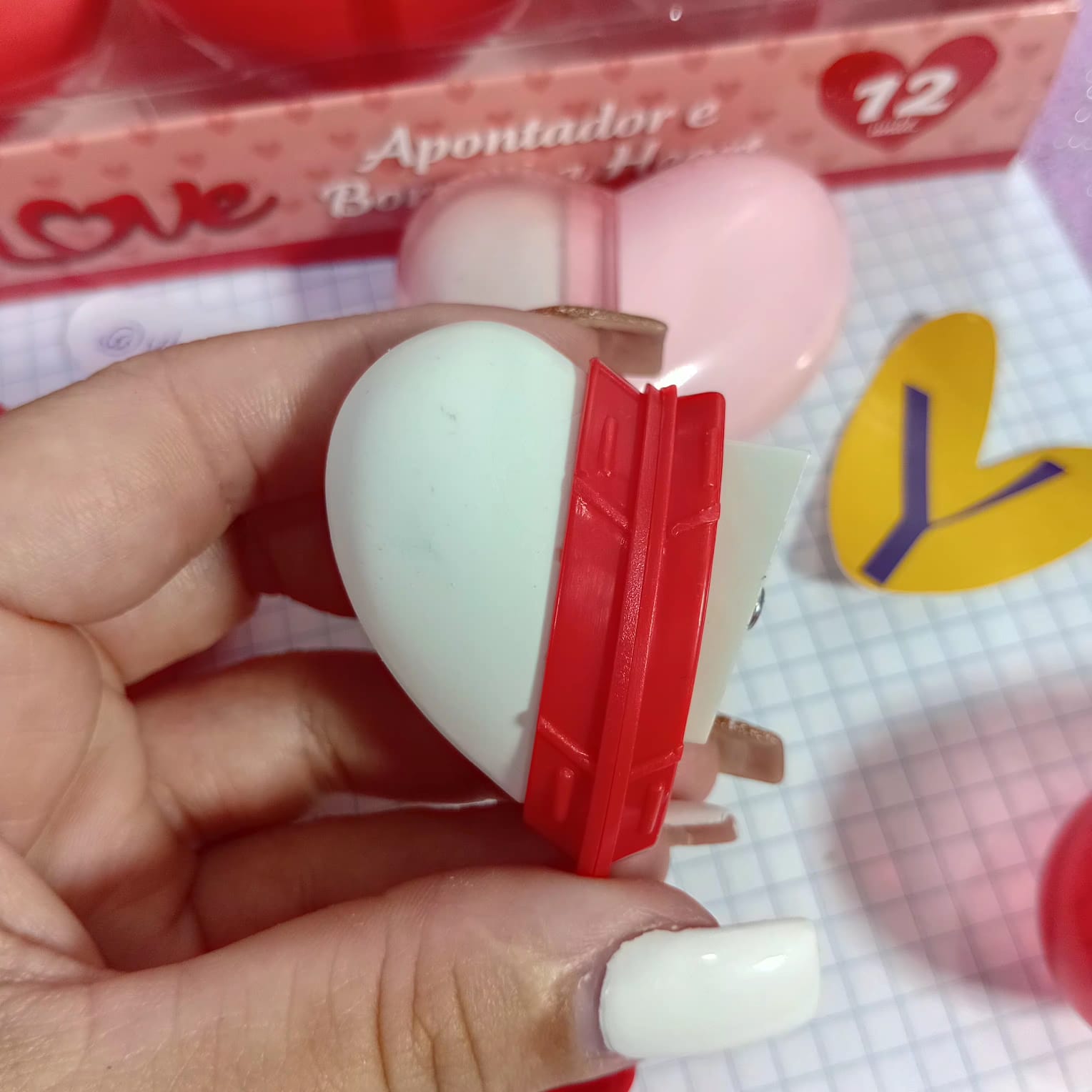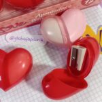 Apontador 2 em 1, com borracha integrada, em formato de coração.