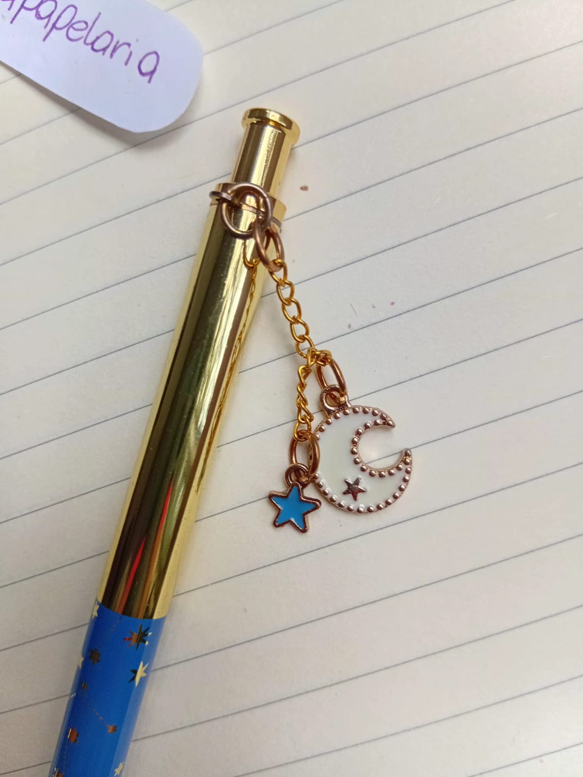 A caneta esferográfica da coleção Gift Pen é perfeita para quem ama detalhes delicados ✨ Possui tinta azul, modelo retrátil, corpo decorado com estrelas e um charme extra com pingente de lua e estrela, além de embalagem para presente, ideal para encantar !!!