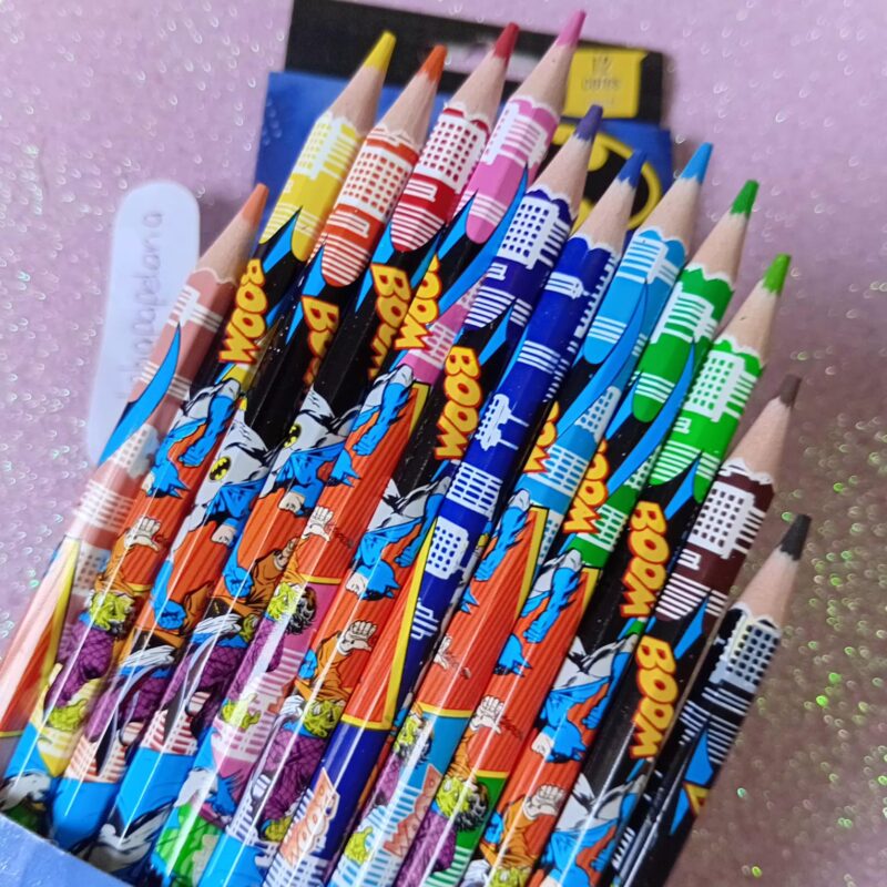 O kit de lápis de cor Batman vem com 12 cores vibrantes, perfeito para desenhos, escola, atividades e projetos criativos. Os lápis têm traço macio e fácil de apontar, deixando a pintura mais confortável e divertida no dia a dia.