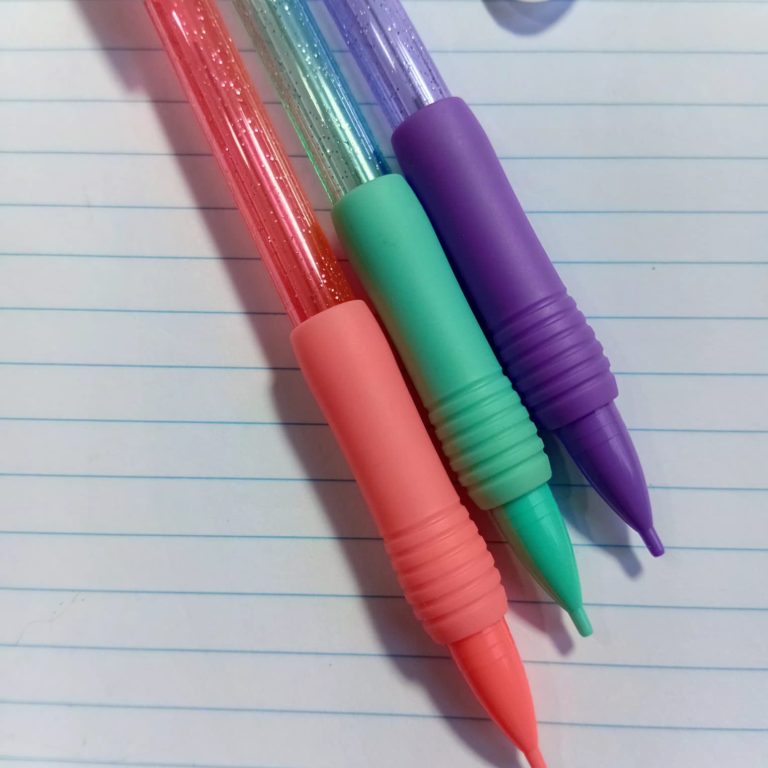 Possui corpo com glitter que brilha muuuito, garantindo um toque lindo e diferenciado no estojo 😍 O grip emborrachado deixa a escrita mais confortável e gostosa. Disponível em 3 cores para escolher 💖✏️
