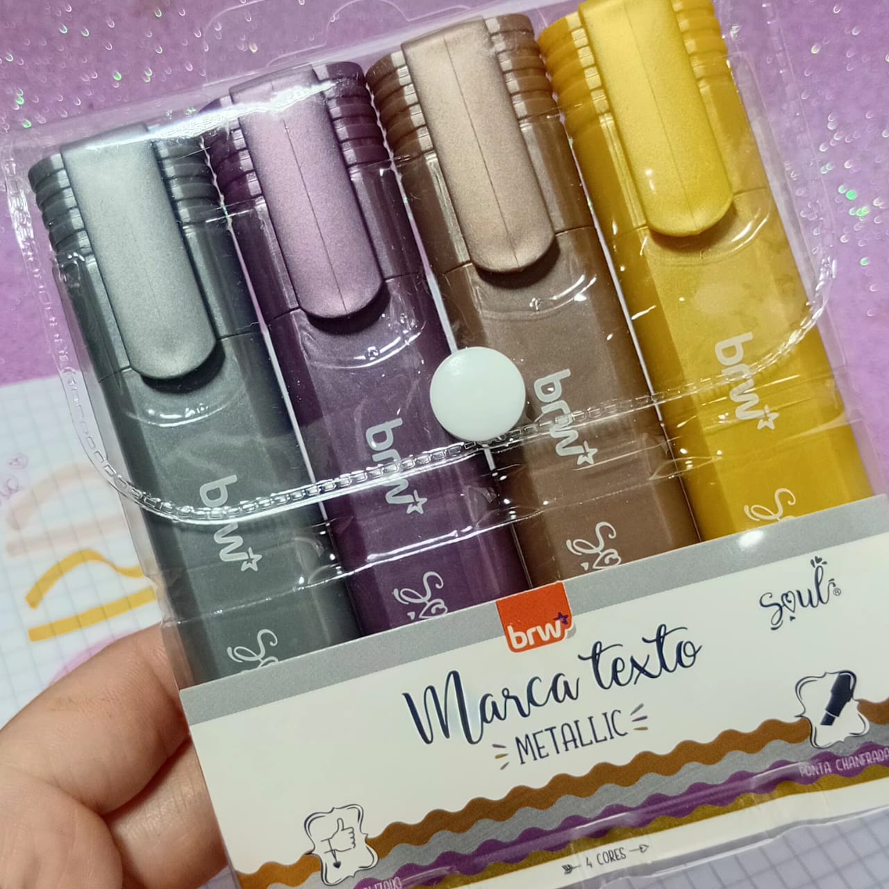 O kit vem com 4 marca-textos metálicos em tons terrosos, super brilhantes e sofisticados.