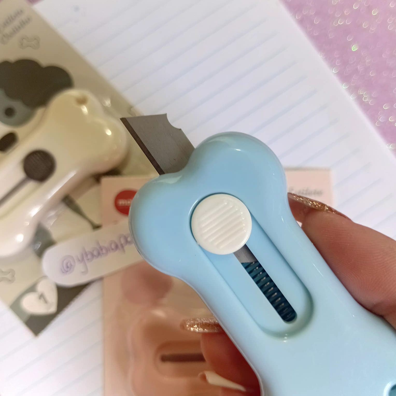 O mini estilete em formato de ossinho é retrátil e possui lâmina 9mm, ideal para cortar papéis, adesivos, embalagens e pequenos materiais do dia a dia. Compacto e leve, cabe no estojo ou na bolsa e deixa o cantinho de estudos cheio de personalidade.