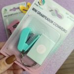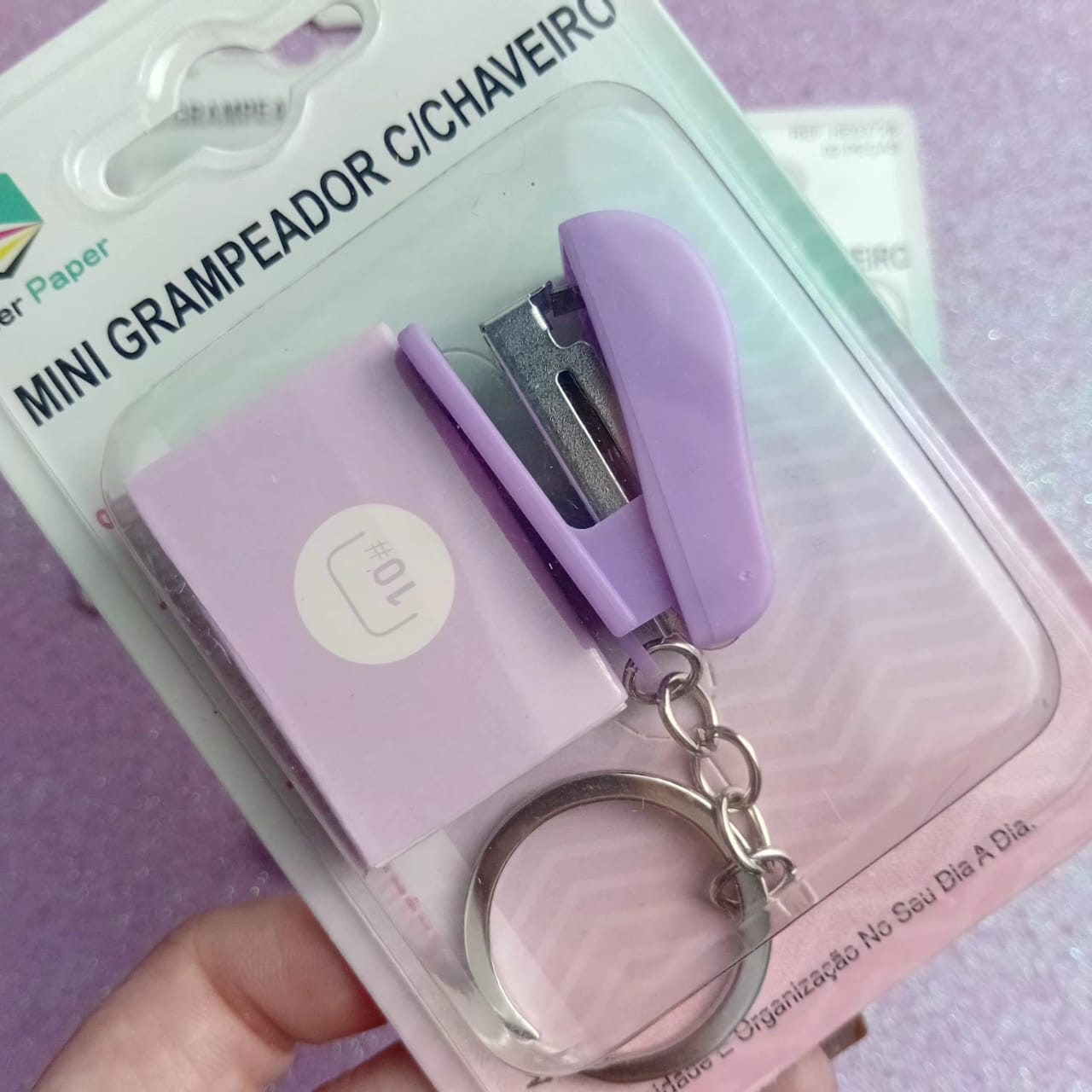 Esse mini grampeador vem com chaveiro, perfeito pra levar na bolsa, estojo ou mochila, e acompanha uma caixinha de grampos pra usar sempre que precisar.