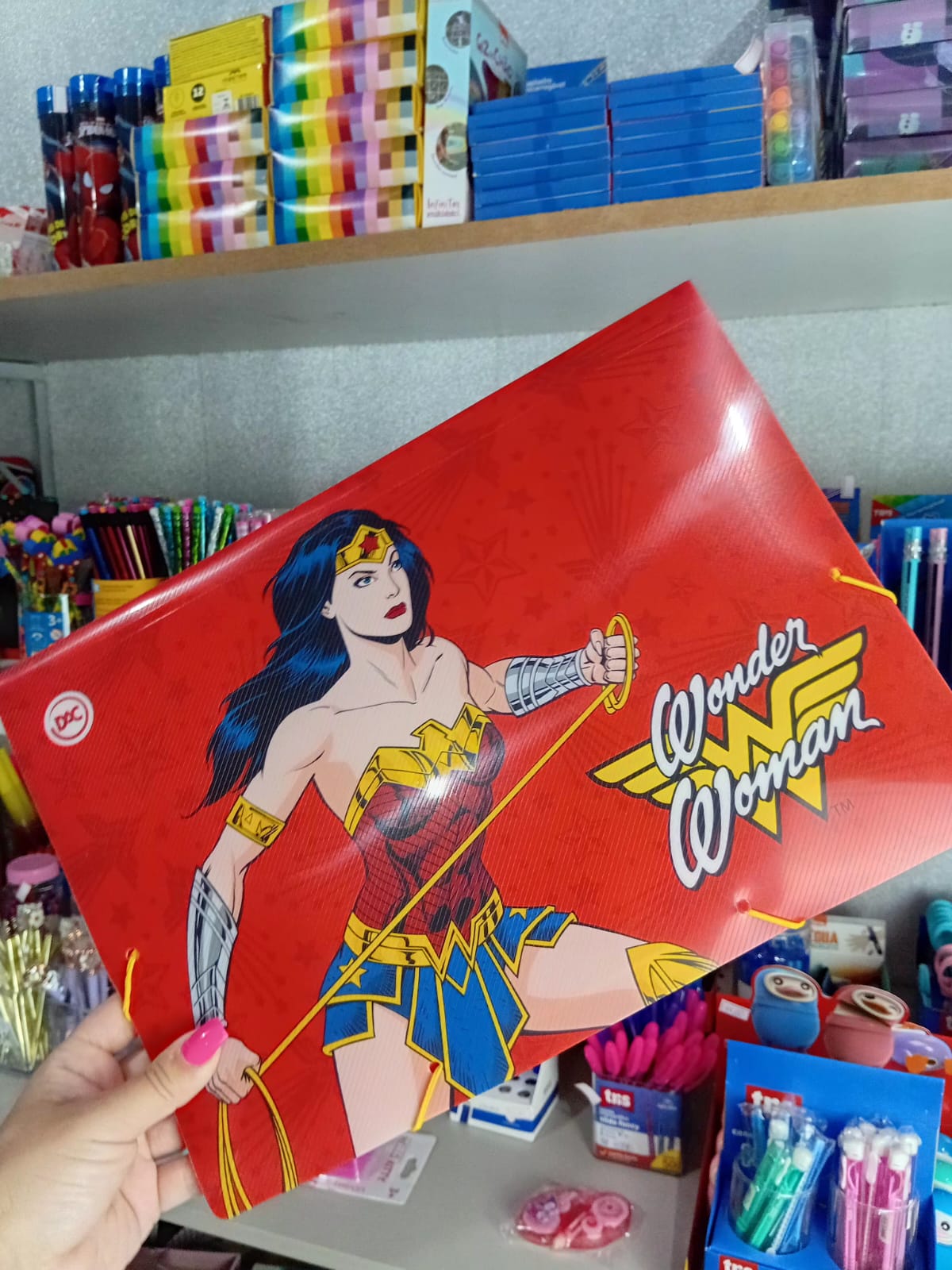 A pasta modelo fino Mulher Maravilha é prática e estilosa, ideal para organizar documentos, trabalhos escolares ou papéis do dia a dia.
